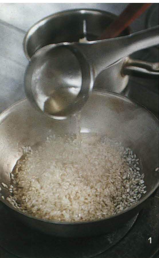 Pour 1 cup chicken broth into the rice mixture.